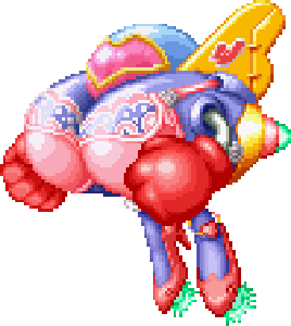 In the original Super Famicom version, her lips are painted on the cockpit's shield, whereas in the PSX/Saturn port, they are hidden under the windshield and are only visible as she yells while taking damage. Her weak point is the windshield/head and she can only be damaged while not performing attacks.