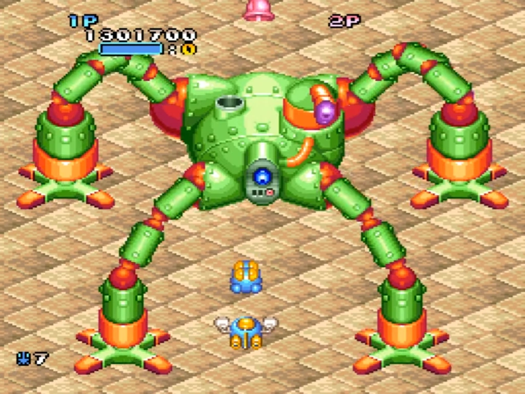 After sustaining enough damage, all of its four legs get destroyed, although the limbs will remain in place and act as silos that shoot large missiles, which once hit will split into three smaller missiles. The player must keep shooting the eye to defeat the boss.
